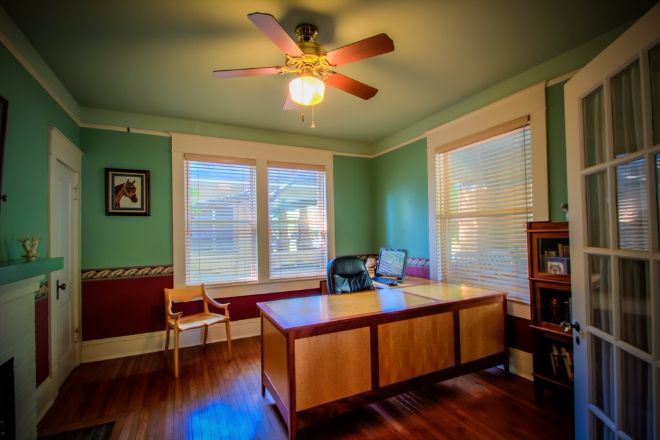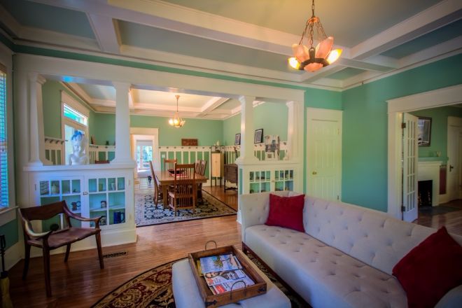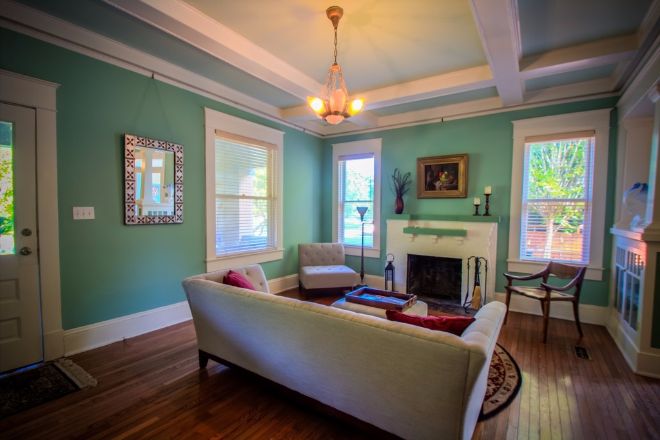 Sure, the home has lovely hardwood floors — but with those vibrant teal walls, down is practically the last place your eyes go when entering the door. With at least a window on every outside-facing wall, there's plenty of sunshine getting into this space.