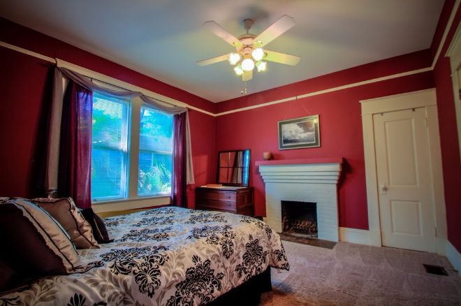 The rouge acted as an accent in the other spaces, but here, it's on full display, lending an intimate feeling to a spacious bedroom.