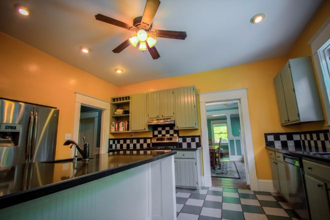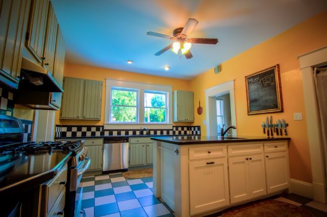 Woah — check out this kitchen! Those checkerboard tiles are a blast to the past, as are the cabinet doors. While the decor may have been frozen in the 50s, the appliances have all been brought up to modern day.